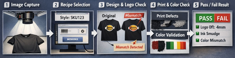 In apparel manufacturing, a “good-looking” print can still fail quality for reasons that are subtle but costly: a logo 3–5 mm off-center, slight color drift between batches, a smeared edge that becomes obvious after wash, or missing micro-elements in a design. Manual inspection struggles because it’s slow, subjective, and inconsistent under different lighting and shift conditions.