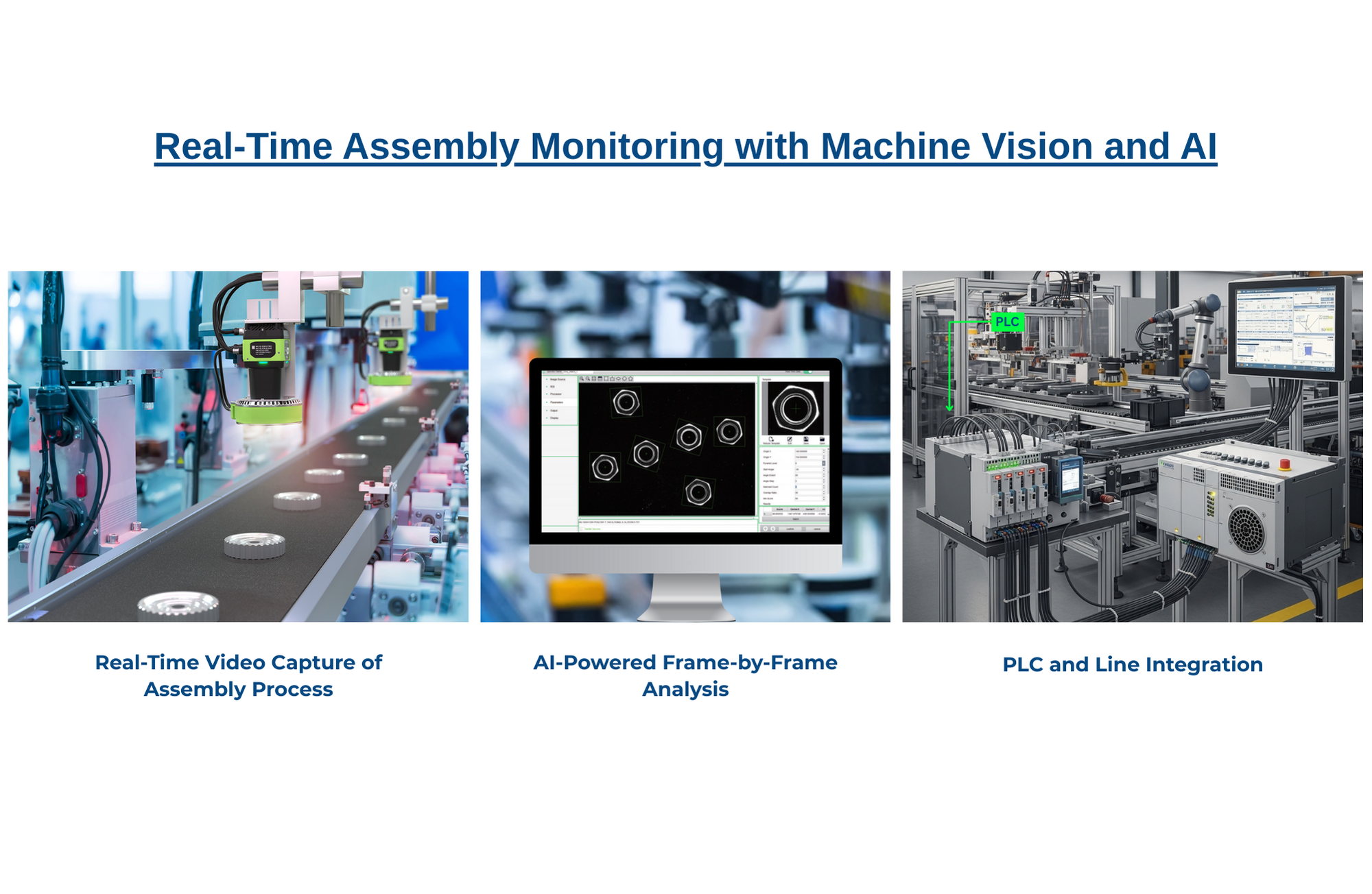 Cameras are positioned to capture key angles and areas—such as component placement zones, tool engagement points, fastening areas, etc.