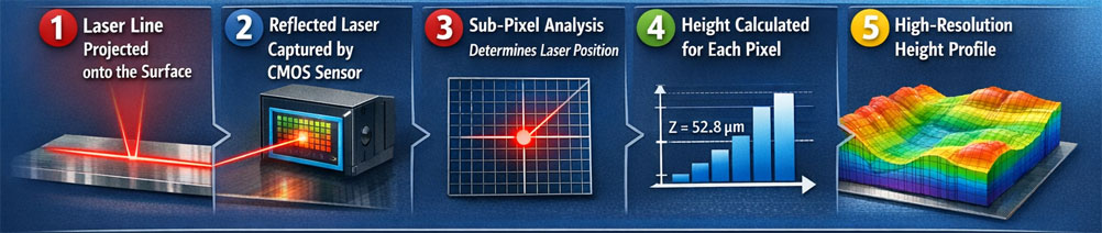 - 1 A sharp laser line is projected onto the part surface