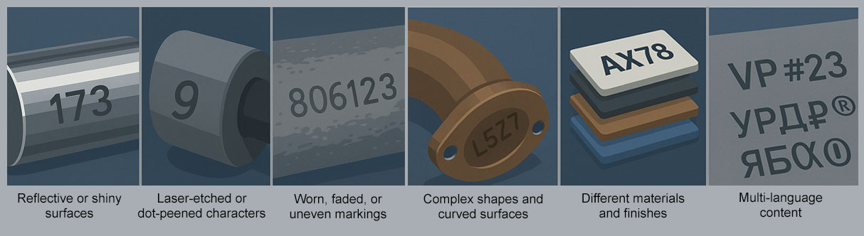 Reading text, numbers, or markings from industrial parts is not as simple as scanning a printed label. In real-world conditions, manufacturers deal with challenges like: