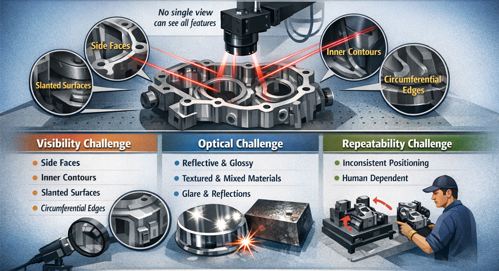 Unlike flat or single-face components, multi-surface parts present three major challeng