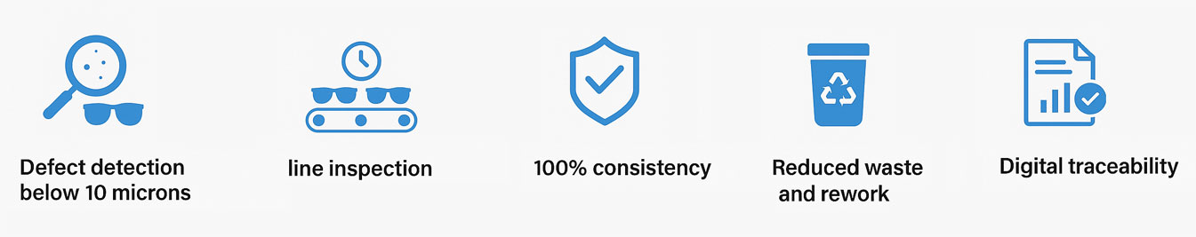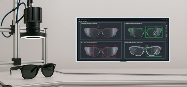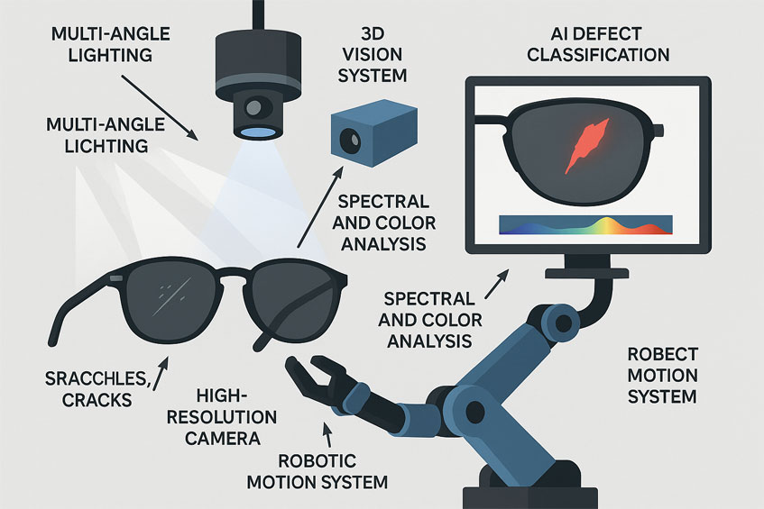Modern sunglass inspection uses high-resolution imaging and AI software to detect even the tiniest flaws. Key technologies include: